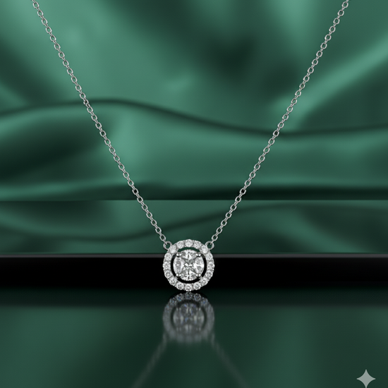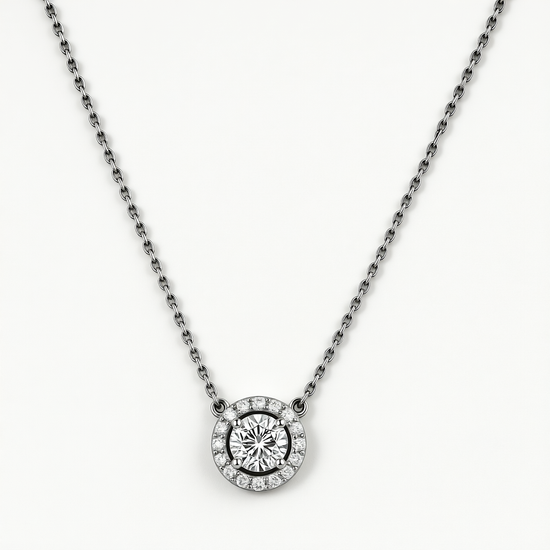 Complete your sophisticated set with this stunning Diamond Halo Pendant Necklace. Designed to perfectly complement the matching earrings, this piece features the same captivating halo design.