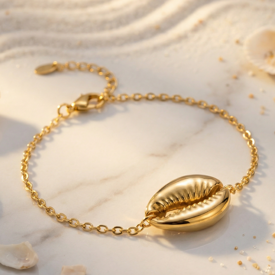 مصنوع من الذهب عيار 18 قيراطًا، سوار رقيق مستوحى من المحيط يتميز بسحر صدفة ذهبية يجسد صفاء الشاطئ والأناقة الخالدة.