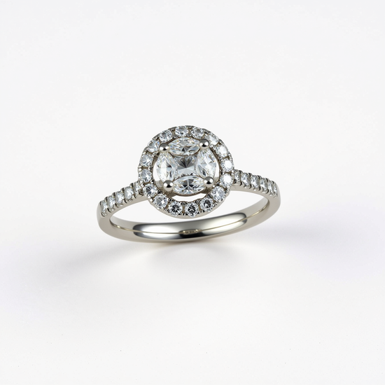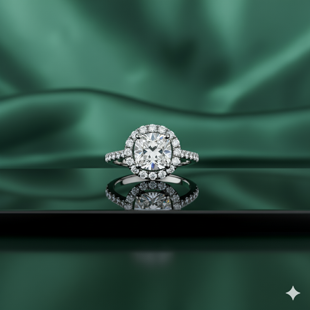 A true embodiment of luxury and romance, this breathtaking halo ring is designed for unforgettable moments. It features a mesmerizing cushion-cut center diamond, encircled by a brilliant halo of smaller diamonds that amplify its size and sparkle.