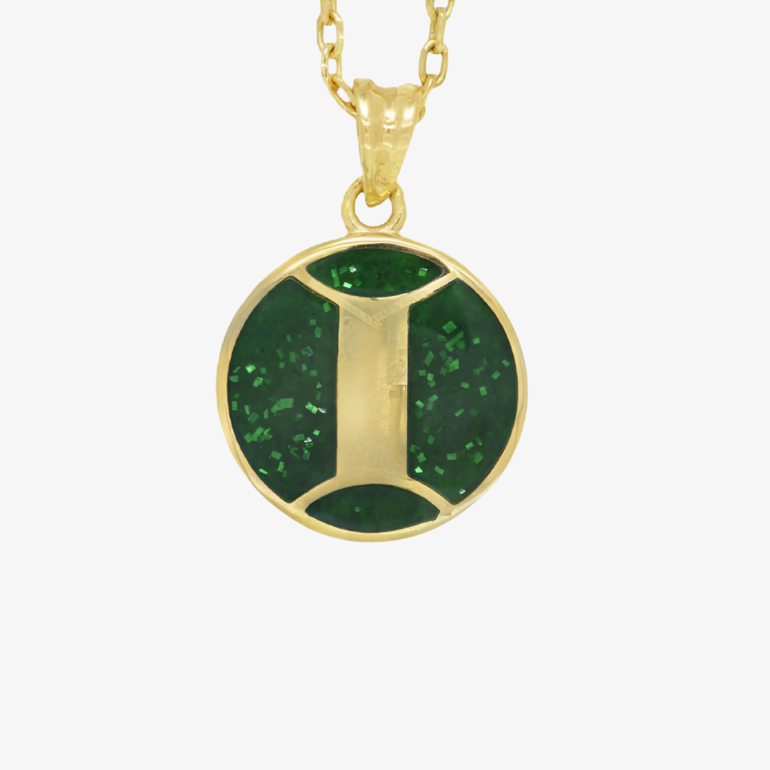 This necklace is made from 18K gold, A zodiac-inspired piece that features the Gemini sign with a luxurious emerald touch.