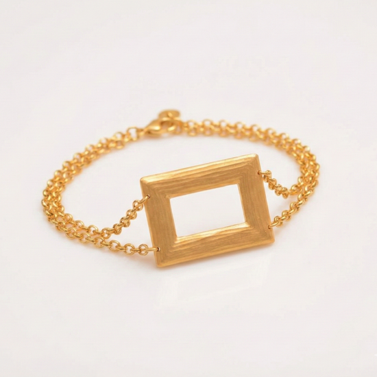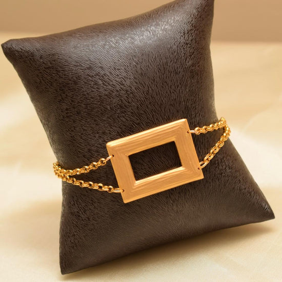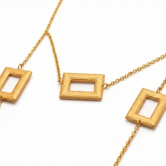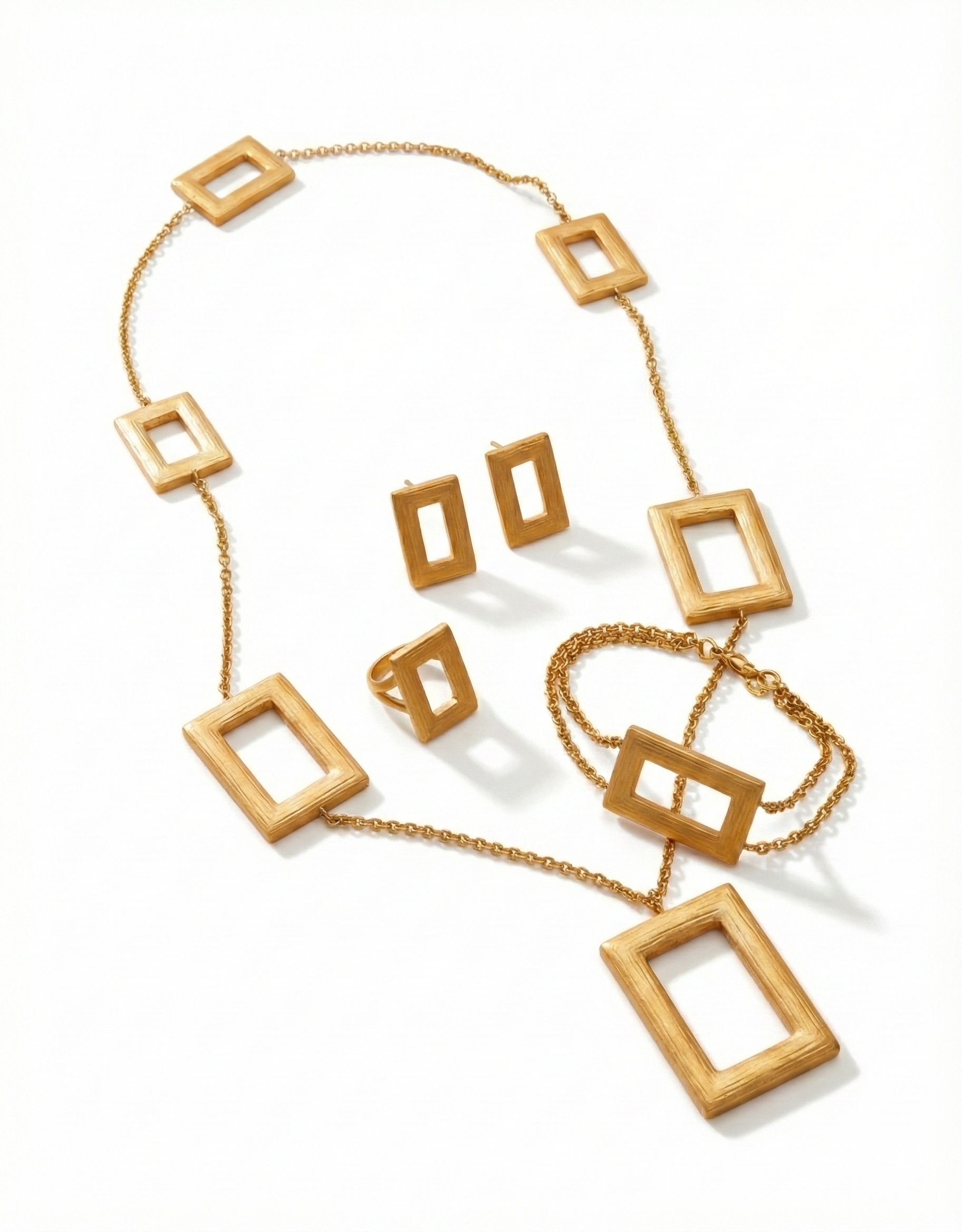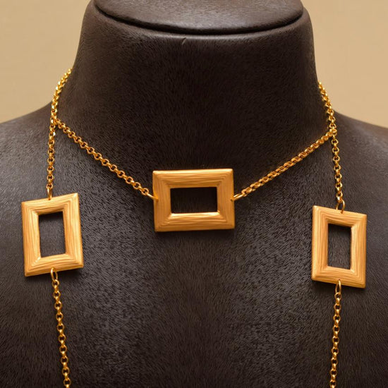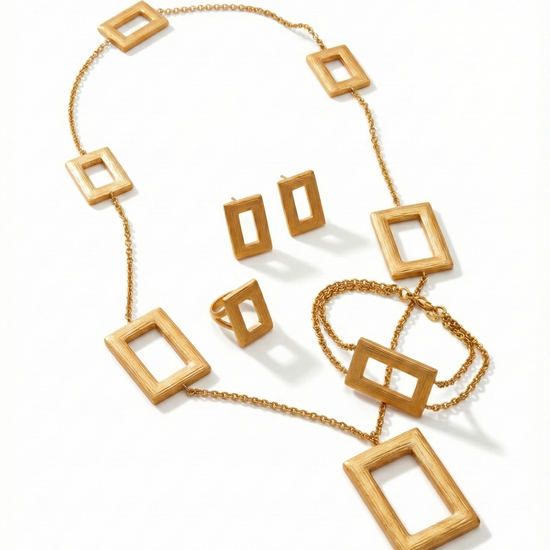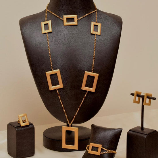 A bold and contemporary expression of style, this 21K gold jewelry set is defined by its distinctive rectangular motifs. Featuring a long statement necklace with graduated geometric shapes, accompanied by matching earrings, ring, and bracelet, this set exudes modern elegance with architectural precision.