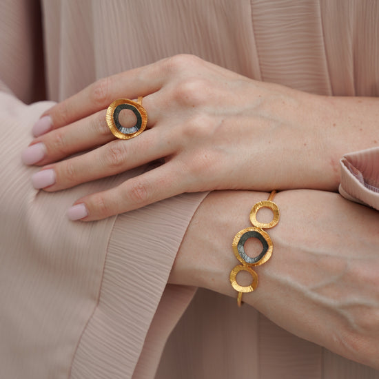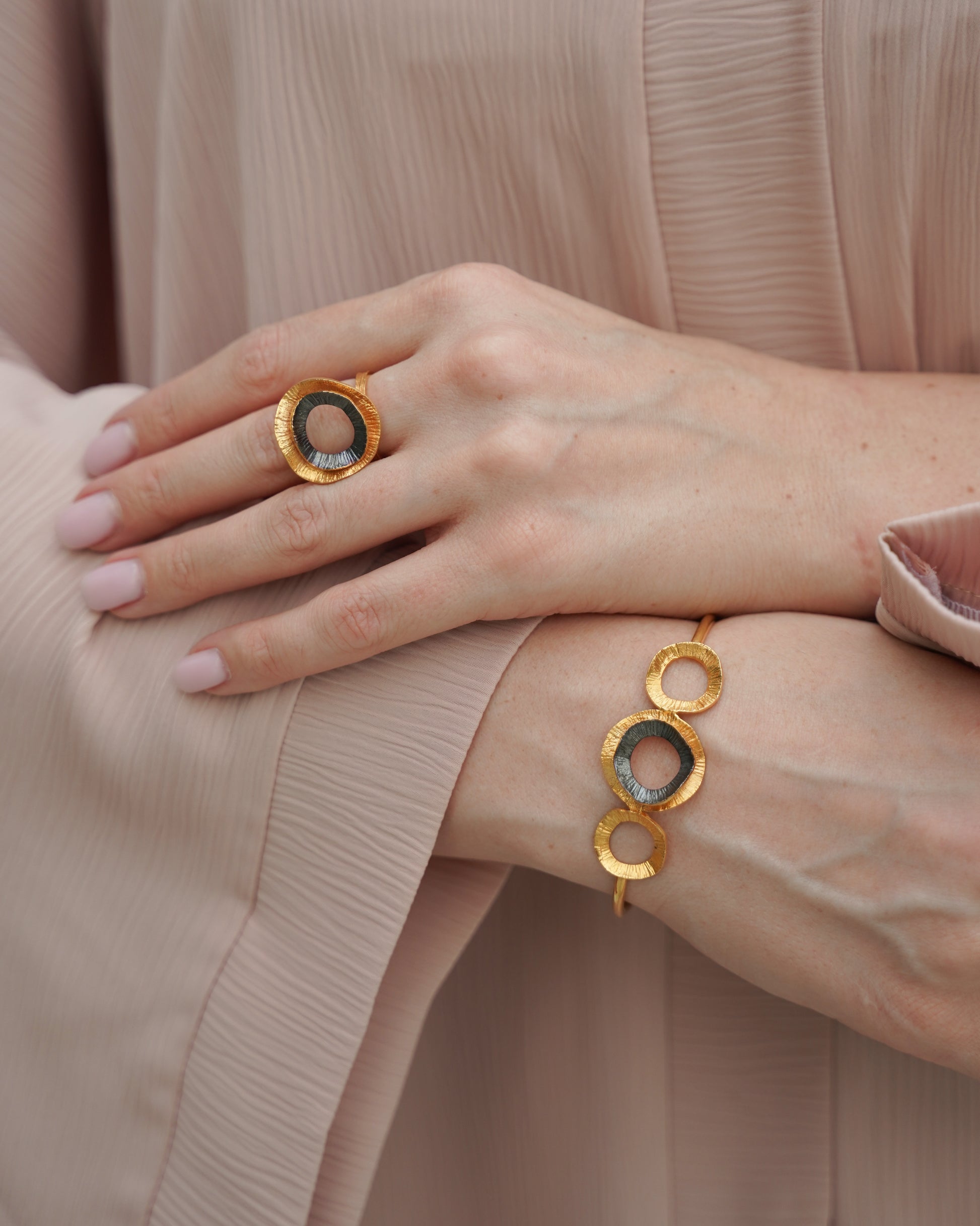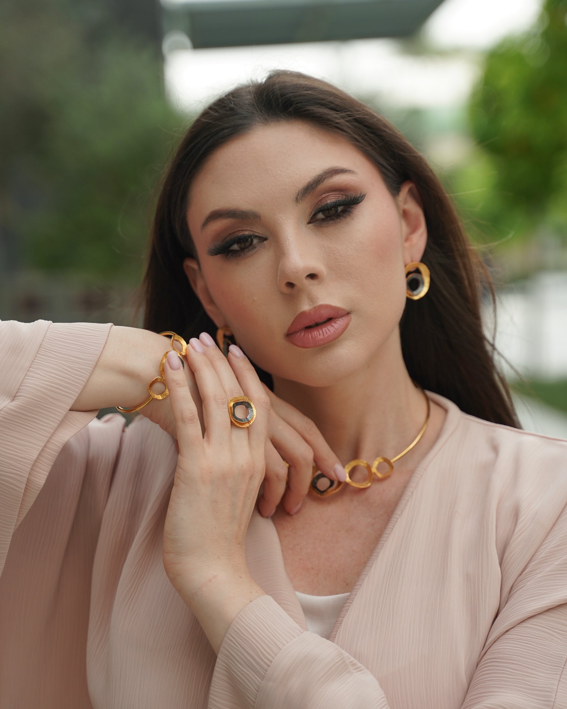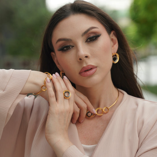 and duality. With its refined necklace, bracelet, ring, and earrings,