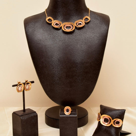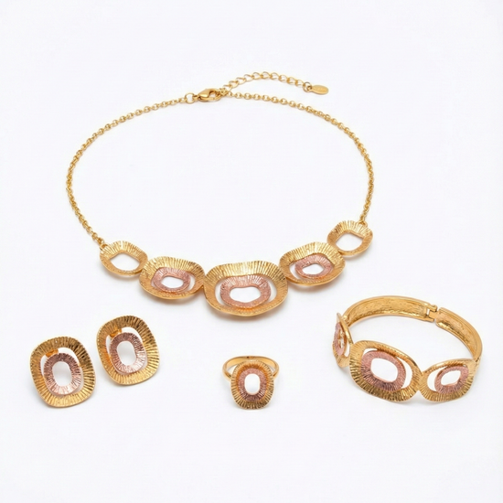 Includes a necklace, matching stud earrings, bracelet, and an elegant ring.