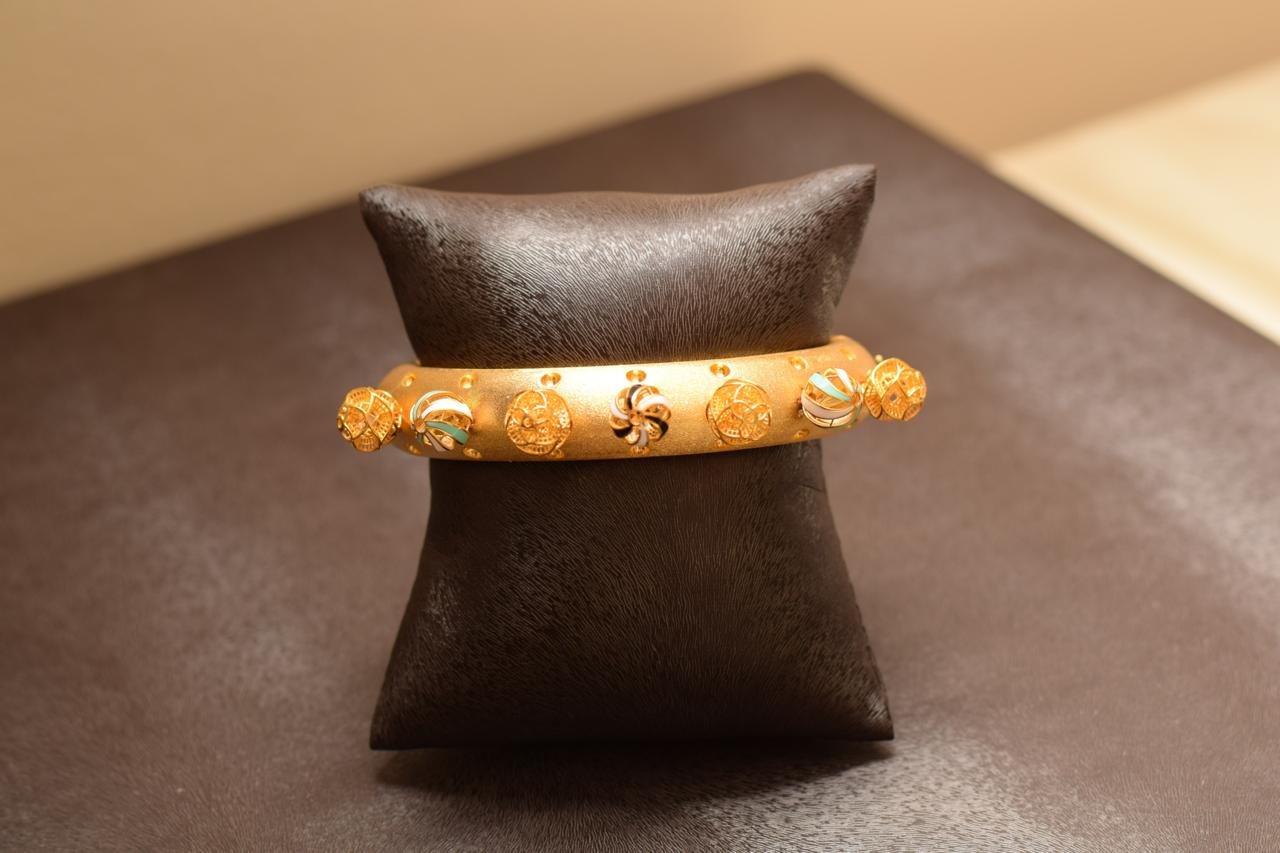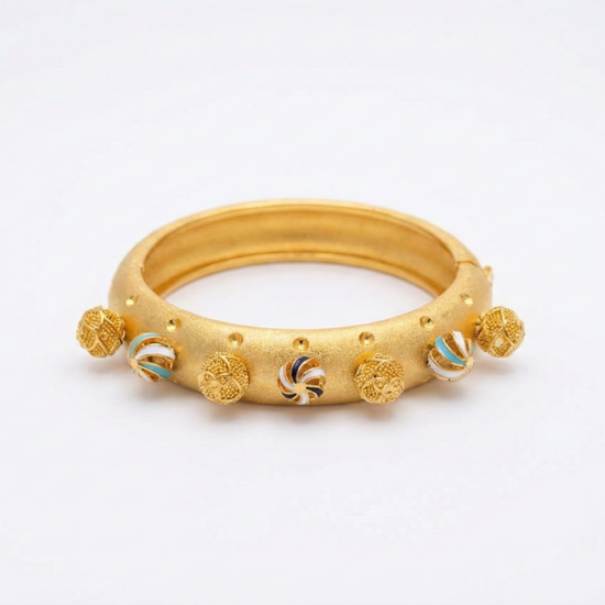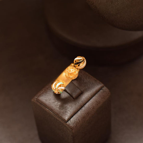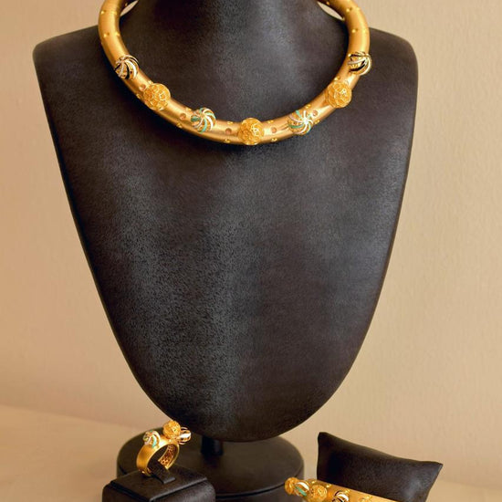 Art meets gold in this 21K set, where sculpted floral reliefs are carved into a thick collar necklace and mirrored on the bracelet and ring. The design combines timeless structure with natural romance, resulting in a collectible set of enduring charm.