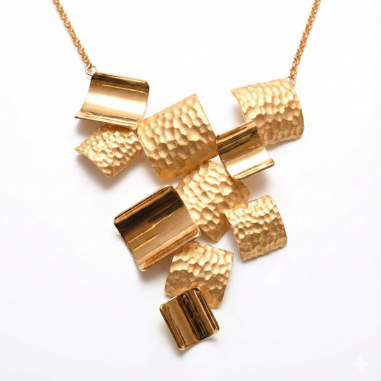 A celebration of movement and texture, this 21K gold set captivates with its cluster of hammered and high-polish segments. The dynamic, sculptural necklace is paired with matching earrings, bracelet, and ring, offering a powerful style statement.