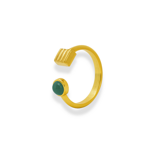 An open 21K gold ring that blends simplicity with elegance. Adorned with a green gemstone symbolizing vitality and balance, and finished with a sculpted detail inspired by ancient motifs. A distinctive piece that merges heritage and modern style — perfect for everyday wear or special occasions
