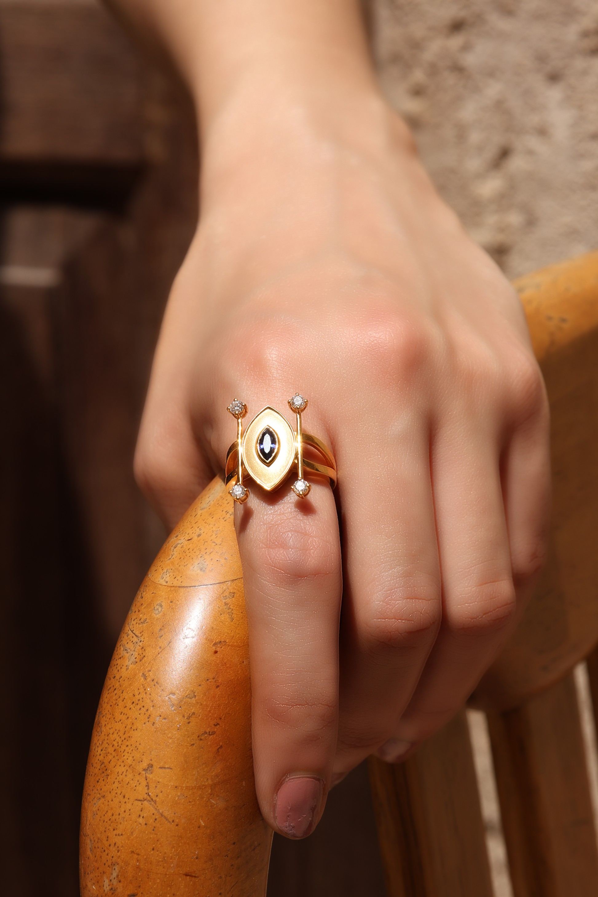 21K gold ring featuring a radiant deep-blue stone surrounded by shimmering lab diamonds — a masterpiece of royal elegance and timeless allure.